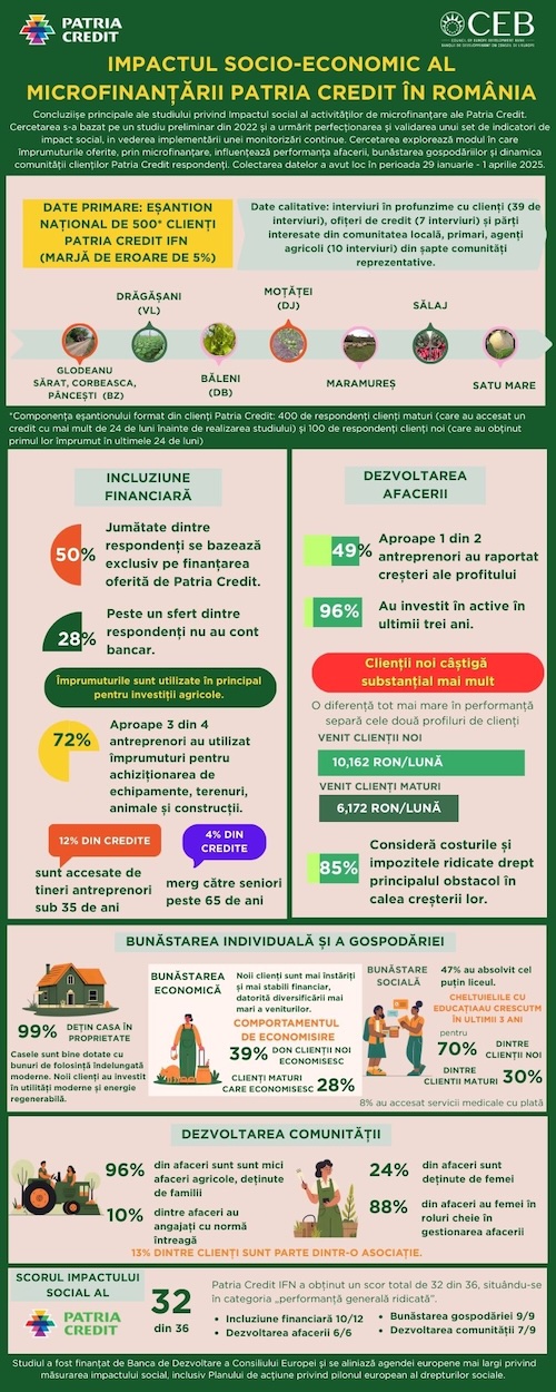 Microfinanțarea stimulează creșterea afacerilor (49% dintre respondenții studiului au înregistrat o creștere a profitului, 96% au marit investiții) și îmbunătățește bunăstarea gospodăriilor (99% dintre respondenți dețin locuințe proprii, economii și... detalii