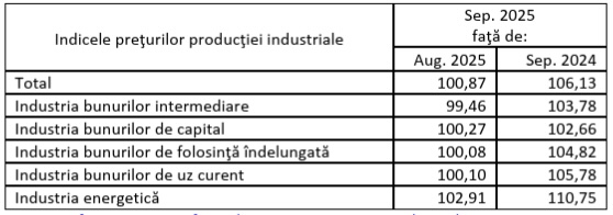 Indicele preţurilor producţiei industriale (IPPI) a crescut în septembrie 2025 cu 0,87% față de luna precedentă, potrivit datelor comunicate de INS.
