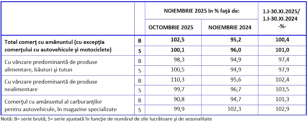 Cifra de afaceri din comerțul cu amănuntul (fără autovehicule și motociclete) a crescut în noiembrie 2025 față de luna anterioară cu 2,5% pe seria brută însă numai 0,1% pe cea ajustată sezonier, potrivit datelor comunicate de INS. Indicatorul lunar a rămas clar pe minus dar valoarea cumulată de la începutul anului a rămas ușor pe plus