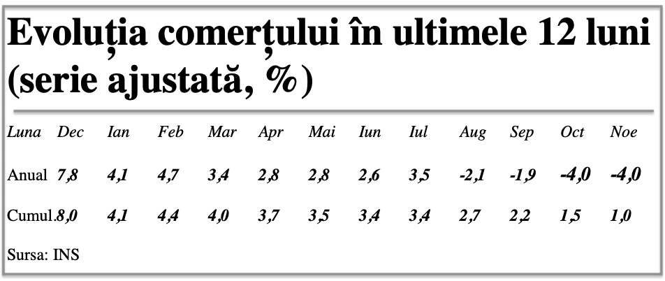 Comparativ cu noiembrie 2024, s-a înregistrat o diminuare de -4,8% pe seria brută și de -4% în termeni ajustați cu sezonalitatea. Situația reflectă menținerea inflației anuale aproape pragul de 10%, în contextul neindexării pensiilor și salariilor. Totuși, în perioada ianuarie-noiembrie 2025 s-a păstrat un mic avans (+0,4% brut, respectiv +1% ajustat).