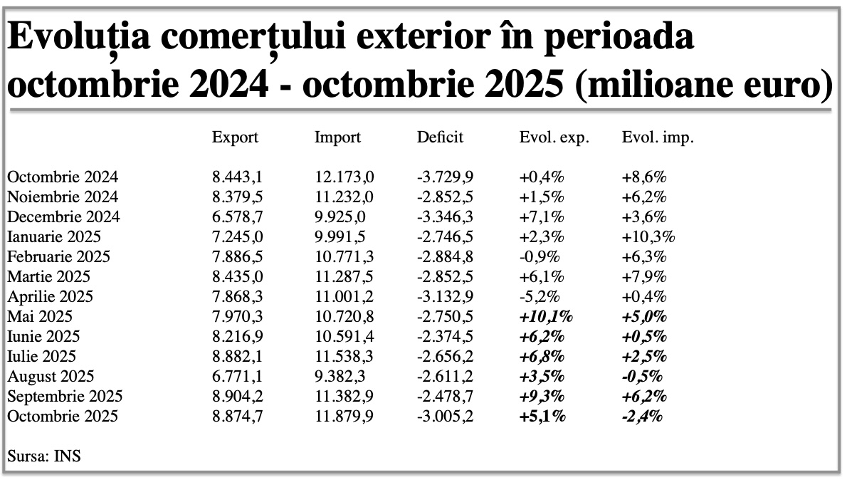 Exporturile României au fost în octombrie 2025 de 8,9 miliarde euro (+5,1% față de aceeași lună a anului anterior), în timp ce importurile au însumat valoarea de circa 11,9 miliarde... detalii