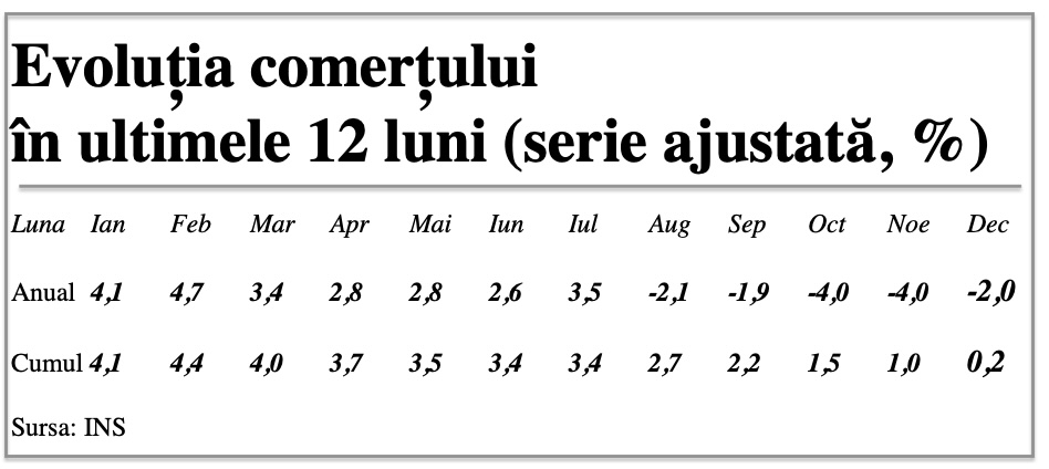 Cifra lunară de afaceri din comerț a trecut pe minus în ultimele cinci luni dar plusurile acumulate în cele șapte luni anterioare au contat ceva mai mult decât efectul de bază, exacerbat de perioada electorală. Este o corelare cu evoluția relativ slabă a economiei (+0,9% brut după primele trei trimestre, date provizorii, față de 2,5%, cât se estima la începtul anului trecut).
