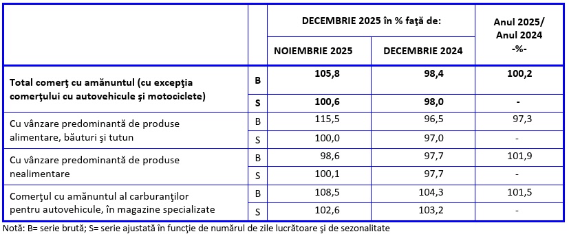 Cifra de afaceri din comerțul cu amănuntul (fără autovehicule și motociclete) a crescut în decembrie 2025 față de luna anterioară cu 5,8% pe seria brută însă numai 0,6% pe cea ajustată sezonier, potrivit datelor comunicate de INS.