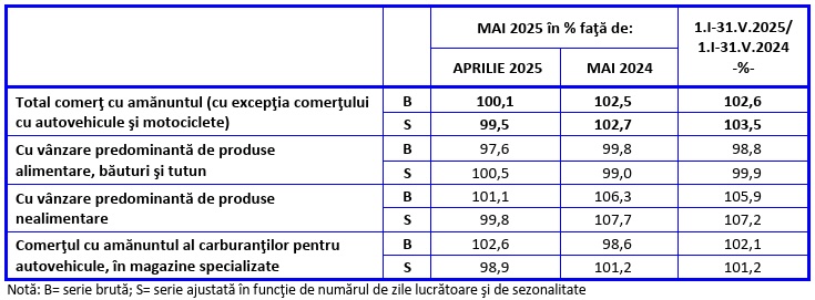 De reținut scăderea brută înregistrată în mai 2025 față de luna anterioară la produse alimentare, băuturi și tutun (-2,4%, deși numai +0,5% ajustat). La produse nealimentare (+1,1% brut și -0,2% ajustat) și carburanți (+2,6%, respectiv -1,1%) situația a fost inversă.