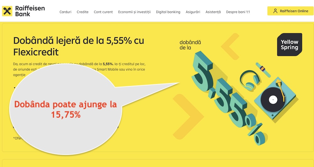Raiffeisen Bank își face incorect reclamă la credite cu „dobândă de la 5,55%”, dar fără să arate până la cât ar putea crește dobânda. Dobânda din reclamă este valabilă doar... detalii