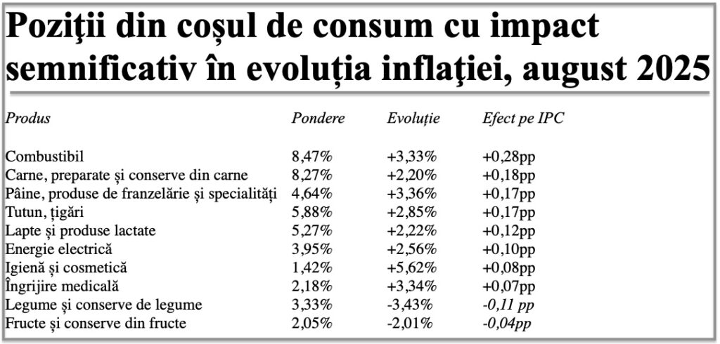 Pe segmentul de servicii, indicele a înregistrat creșterea maximă (+2,87%), după o majorare cu +5,62% la igienă și cosmetică (+19,27% față de august 2024 !), +4,19% la restaurante și cafenele, +3,98% la transport urban, +3,34% la îngrijire medicală, +3,25% la reparații auto și valori chiar mai mari la servicii cu pondere mică în coș (+11,02% la transport aerian, +5,85% la confecționat și reparat îmbrăcăminte și încălțăminte și +4,49% la plata cazării).