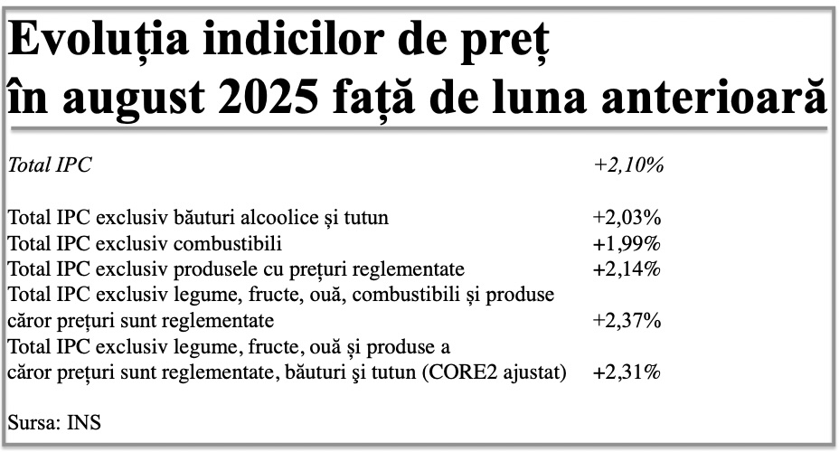Inflaţia MEDIE anuală (ultimele 12 luni față de cele 12 luni anterioare) a crescut doar până la 5,7% mult sub nivelul celei anuale consemnate pentru moment. Pe metodologia europeană IAPC, inflația lunară a fost aproape identică(+2,09% în august 2025) dar valoarea anuală s-a situat la „doar” 8,5% iar cea medie anuală a ajuns la 5,6%, ușor sub cea pe metodologie locală.