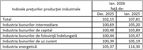 În structură, pe luna ianuarie 2026 s-au consemnat creșteri moderate la bunuri de uz curent (+0,39%), bunuri de folosință îndelungată (+0,44%), bunuri de capital (+0,48%) și ceva mai pronunțate la bunuri intermediare (+0,69%). Influența majoră în sensul creșterii per total a venit din partea industriei energetice (+5,37%).