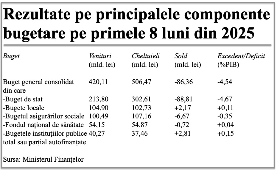 Deficitul bugetului general consolidat pe primele opt luni din 2025 a fost de 86,36 miliarde lei (-4,54% din PIB-ul estimat la 1.902 miliarde lei), potrivit datelor operative publicate de Ministerul... detalii