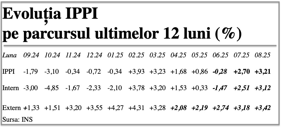 După ce intrase pe o traiectorie de scădere și a coborât în iunie sub nivelul de la mijlocul anului trecut (-0,28%), acest indicator a revenit pe plus (+2,70%) și a păstrat tendința de creștere (+3,21% față de august 2024).