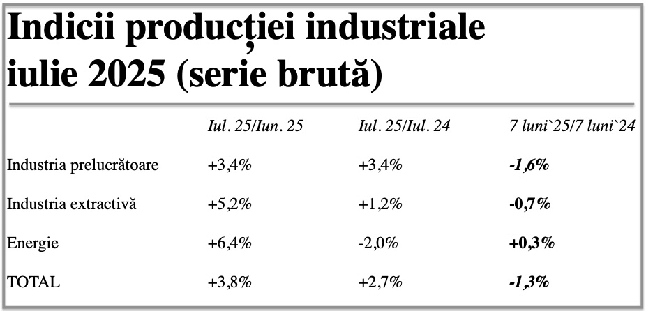 Potrivit INS, producția industrială a crescut în iulie 2025 față de luna anterioară cu 3,8% pe seria brută însă a scăzut cu -0,3% în varianta ajustată după perioada din an... detalii