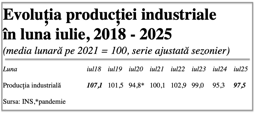 Datele pot fi interpretate mai relevant dacă se face apel la seria producției industriale din aceeași lună iulie pe intervalul 2018 – 2025, cu referința în nivelul mediu lunar consemnat pentru anul de referință 2021 (valoare 100). Diferența între indicele 107,1 din iulie 2018 și cel de doar 97,5% pentru iulie 2025 este elocventă.