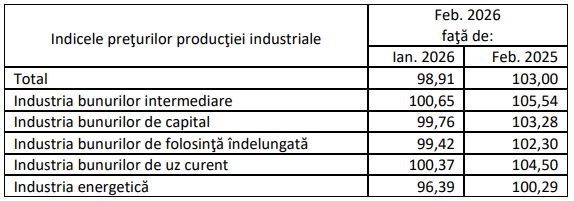 În structură, pe luna februarie 2026 s-au consemnat o creștere moderată la bunuri de uz curent (+0,37%) și una mai consistentă la bunuri intermediare (+0,65%). În schimb, s-au diminuat cu -0,24% prețurile în industria bunurilor de capital și cu – 0,58% la bunuri de folosință îndelungată. Influența majoră în sensul scăderii per total a venit din partea industriei energetice (-3,61%), evident, înainte de evenimentele din Iran.