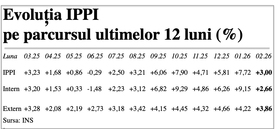 Indicele preţurilor producţiei industriale (IPPI) a scăzut în februarie 2026 cu 1,09% față de luna precedentă, potrivit datelor comunicate de INS. După ce intrase pe o traiectorie de creștere sistematică,... detalii